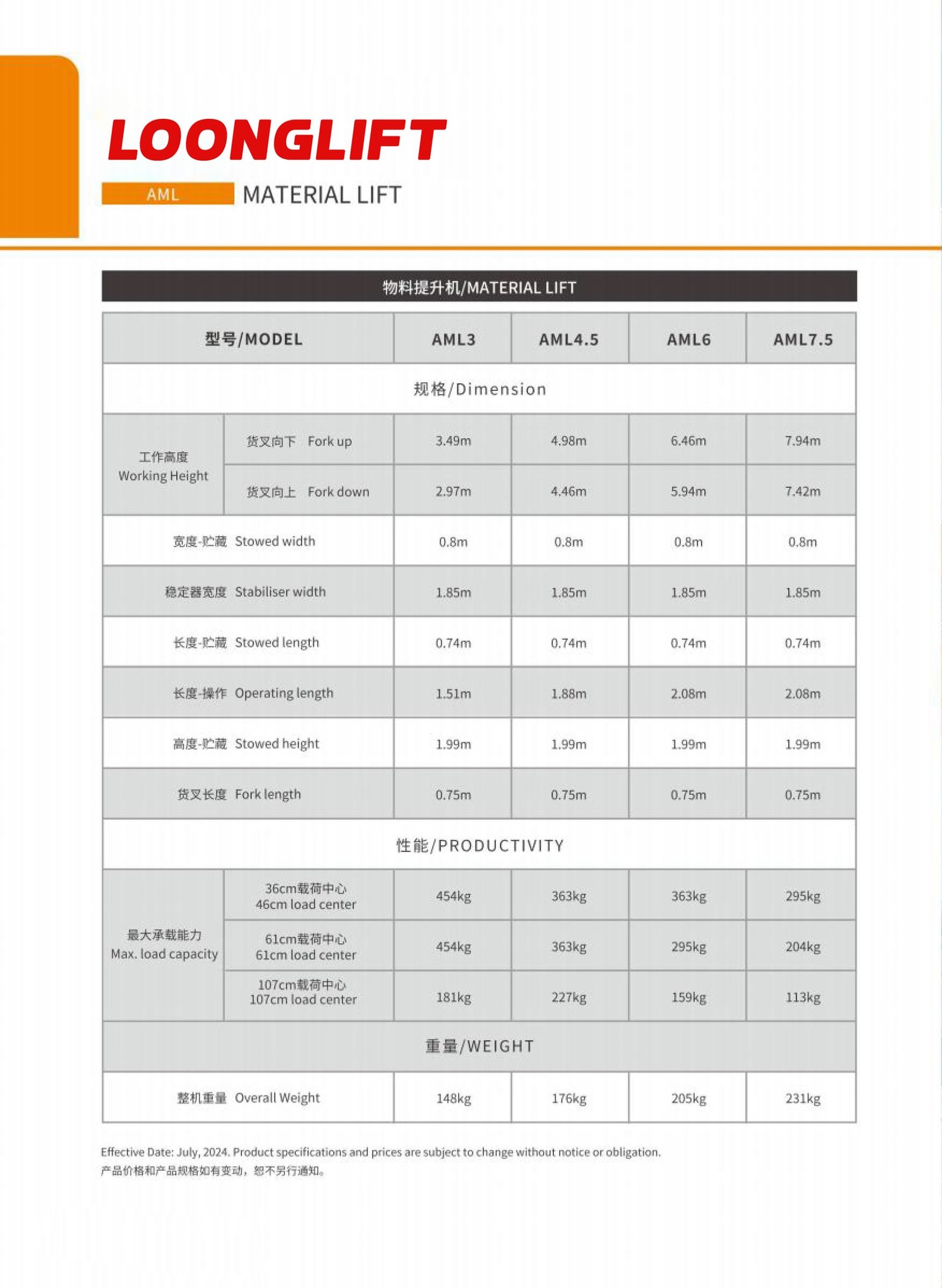 The LOONGLIFT AML Series Material Lift is a compact and portable lifting solution designed for warehouse handling, equipment installation, and maintenance operations at height.