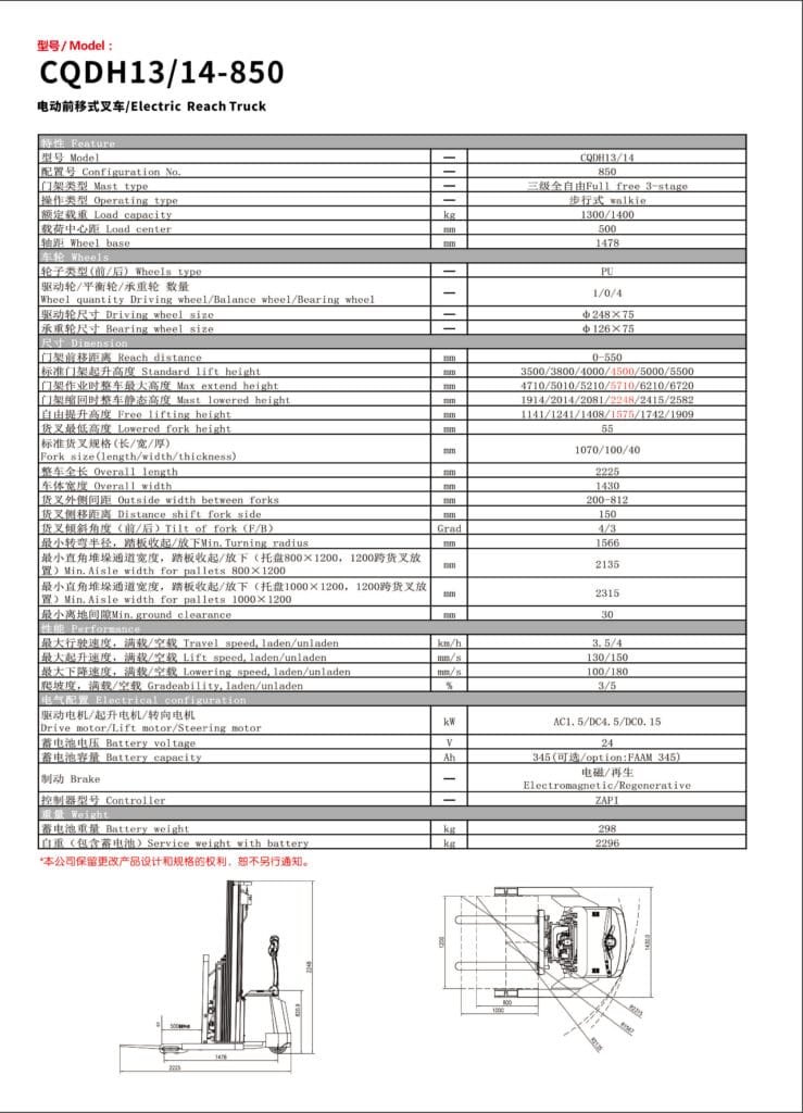 Equipped with Moon Walk function, electronic power steering, and brushless AC drive, the CQDH13/14-850 delivers smooth handling, high efficiency, and low maintenance performance.